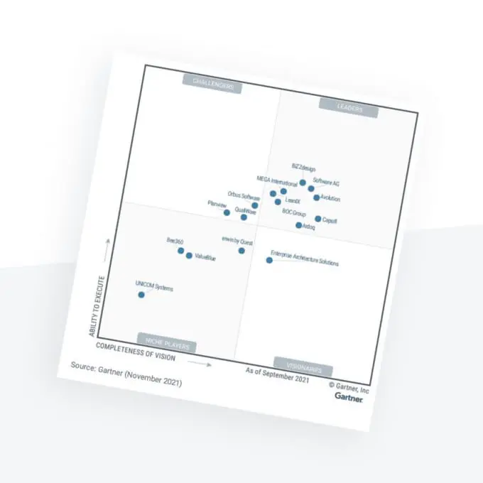 Gartner® 2021 Magic Quadrant™ for Enterprise Architecture tools, by Analysts: Gilbert van der Heiden, Akshay Jhawar, Nolan Hart, published 9 November 2021