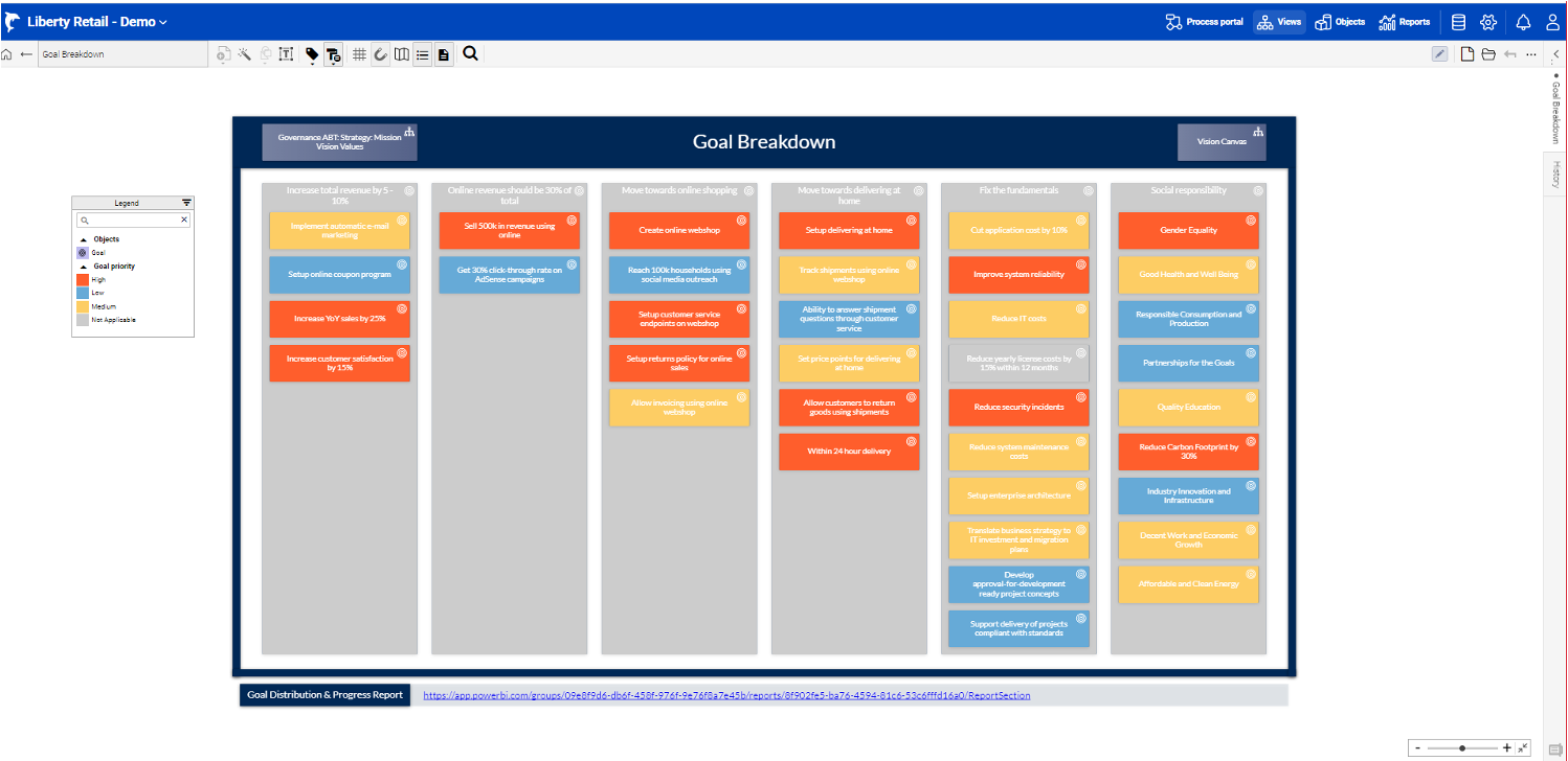 To simplify this process, you can divide the high-level business goals into sub-goals. This breakdown serves multiple purposes – it provides a clear roadmap with more attainable milestones, identifies key stakeholders for execution, and facilitates effective communication. Companies can visualize such a goal breakdown in an EA tool like BlueDolphin, as shown below.