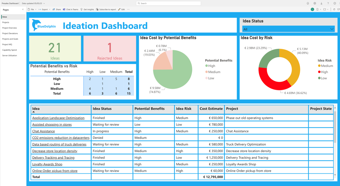 To track proposed ideas, their status, and characteristics, organizations can record them in an Enterprise Architecture tool. In BlueDolphin, you can label them using customizable fields like ROI, risk of failure, or risk of not executing. You can then use this data to create an ideation dashboard in Power BI for a side-by-side comparison of the projects.